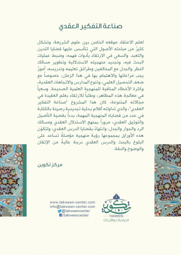 لعلم الاعتقاد موقعه الخاص بين علوم الشريعة، وتشكل كثيرٌ من مباحثه الأصول التي تتأسس عليها قضايا التدين والتعبد. والسعي في الارتقاء بأدوات فهمه، وضبط عمليات البحث فيه، وتجديد منهجيته الاستدلالية وتطوير مسالك النظر والجدل مع المخالفين وطرائق تعليمه وتدريسه، أمورٌ يجب مراعاتها والاهتمام بها في هذا الزمان، خصوصاً مع ضعف التحصيل العلمي، وتنوع المدارس والاتجاهات العقدية، وكثرة الأخطاء المنافية للمنهجية العلمية الصحيحة. وسعياً في معالجة هذه المظاهر، وطلباً للارتقاء بعلم العقيدة في مجالاته المتنوعة، كان هذا المشروع “صناعة التفكير العقدي”، والذي تداولته أقلام بحثية تجديدية رصينة بالكتابة في عدد من قضاياه المنهجية المهمة، بدءاً بقضية التأصيل والتوثيق العقدي، مروراً بمنهج الاستدلال العقدي ومسالك الرد والحوار والجدل، وانتهاءً بقضايا الدرس العقدي، ولتكوّن هذه الأوراق بمجموعها رؤية منهجية مؤصلةً تساعد على البلوغ بالبحث والدرس العقدي درجة عاليةً من الإتقان والوضوح والدقة.
