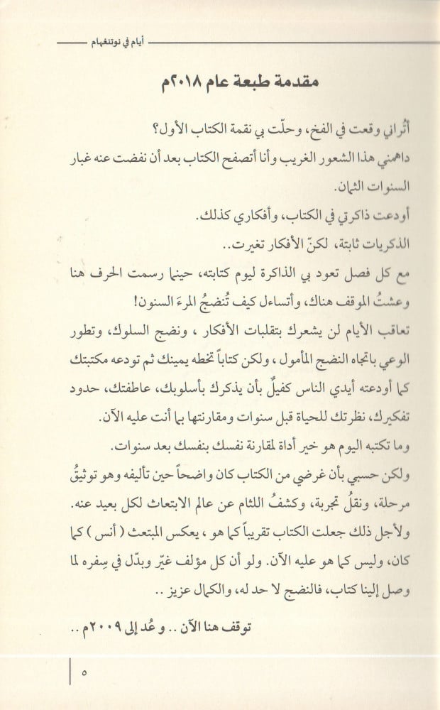 ولكن حسبي بأن غرضي من الكتاب كان واضحاً حين تأليفه وهو توثيقُ مرحلة، ونقلُ تجربة، وكشفُ اللثام عن عالم الابتعاث لكل بعيد عنه. ولأجل ذلك جعلت الكتاب تقريباً كما هو ، يعكس المبتعث ( أنس ) كما كان، وليس كما هو عليه الآن. ولو أن كل مؤلف غيّر وبدّل في سِفره لما وصل إلينا كتاب، فالنضج لا حد له، والكمال عزيز ..