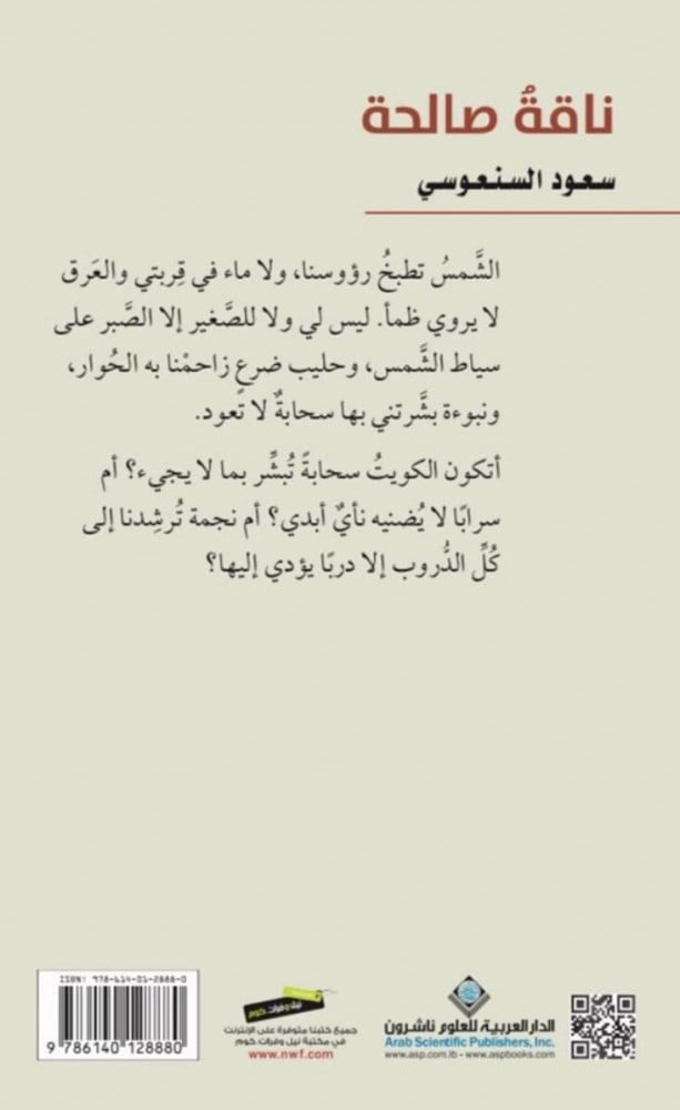 الشَّمسُ تطبخُ رؤوسنا. ولا ماء في قِربتي والعَرق لا يروي ظمأ. ليس لي ولا للصَّغير إلا الصَّبر على سياط الشَّمس، وحليب ضرعٍ زاحمْنا به الحُوار، ونبوءة بشَّرتني بها سحابةٌ لا تعود. أتكون الكويتُ سحابةً تُبشِّر بما لا يجيء؟ أم سرابًا لا يُضنيه نأيٌ أبدي؟ أم نجمة تُرشِدنا إلى كُلِّ الدُّروب إلا دربًا يؤدي إليها؟ يبدو أني أموت. أدركُها ميتة على ظهر ناقتي، وقتَ تدلفُ الحاضِرة مع ابنها يلتقيان ساري، ويلتقي ولدي من؟.